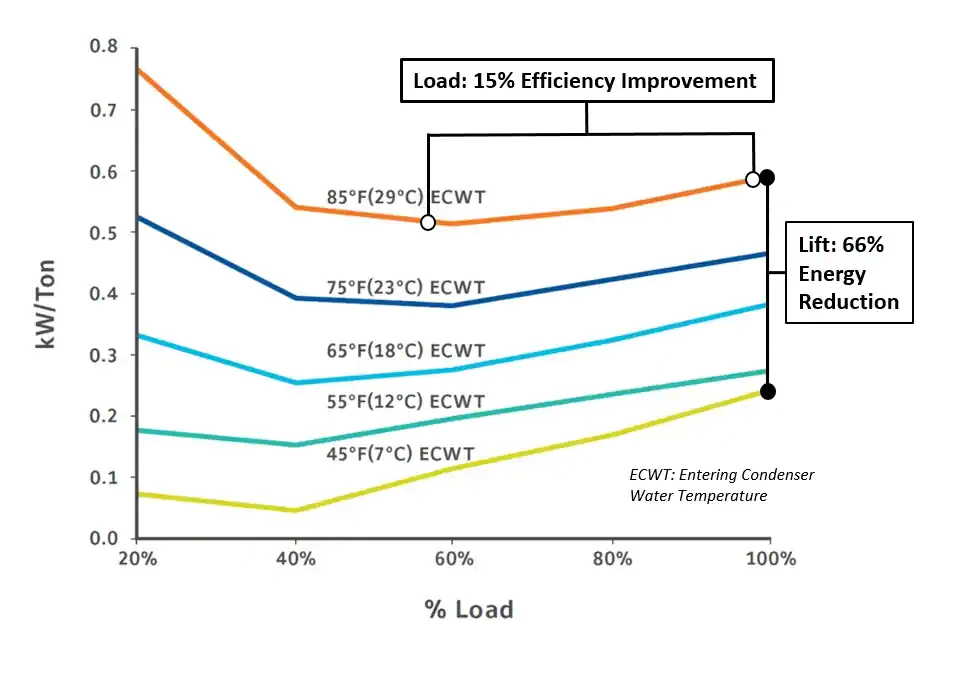 Chiller load is the amount of cooling the chiller provides, while lift determines how hard the chiller must work to deliver the cooling. The greater the difference between evaporator and condenser pressures, the greater the lift and the more work the compressor must perform. By reducing the lift, more energy savings can be realized.